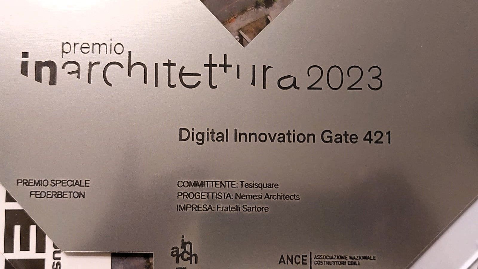 L’opera premiata - il Digital Innovation Gate 421 dell’azienda informatica Tesisquare di Cherasco, in provincia di Cuneo - è considerata il primo polo di Open Innovation del Piemonte: è cioè un hub in cui più aziende non concorrenti possono collaborare insieme a start-up e a progetti di ricerca universitari, secondo una modalità cross-fertilizzante. L’architettura esalta questa nuova concezione di sviluppo collaborativo e crea un “borgo dell’innovazione”, con volumi modulari flessibili, impostati su una griglia in cemento a facciavista, e servizi integrati che si distribuiscono sul territorio tra piccole piazze e percorsi pedonali, raggiungendo nuovi standard di sostenibilità."