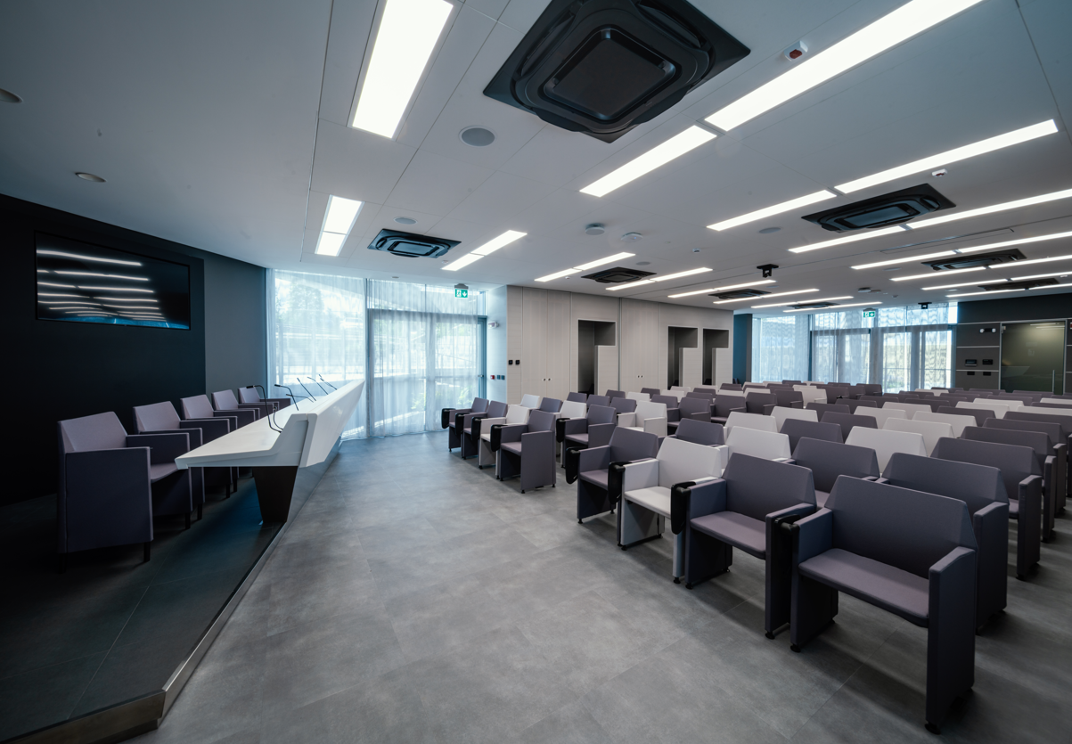 A livello organizzativo il sistema è pensato con accesso da un Foyer esterno, in connessione con i servizi igienici e il guardaroba, oltre a piccoli locali tecnici dedicati. Complessivamente la sala Conferenze con i servizi relativi, ospita 100 posti a sedere, 7 postazioni tecnologiche per giornalisti o traduzione, un palco con 5 posti per relatori, una postazione telescopica, raccordati da un tavolo relatori scultura in corian bianco e un ledwall ad alta definizione. La grande sala conferenze è pensata come uno spazio neutro con sedute mobili nelle nuance del grigio riconfigurabili, e una possibilità di suddivisione in due sale contemporaneamente usabili.